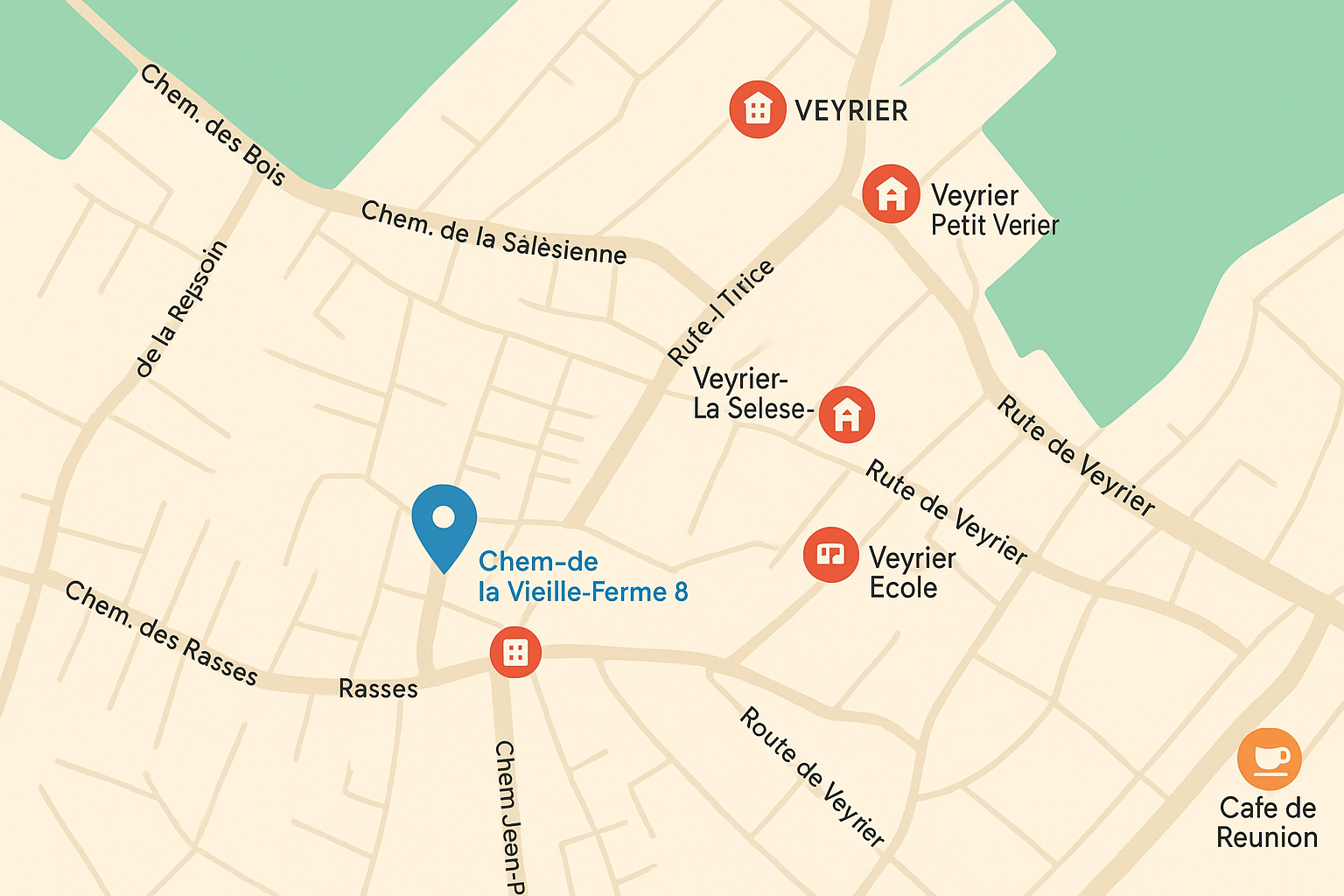 Une localisation idéale aux portes de Genève Située à la frontière française, Veyrier bénéficie d’un accès direct à la campagne et aux sentiers du Salève, tout en restant parfaitement connectée à Genève. La commune est desservie par plusieurs lignes de bus et bien reliée au réseau routier, facilitant les déplacements quotidiens.
